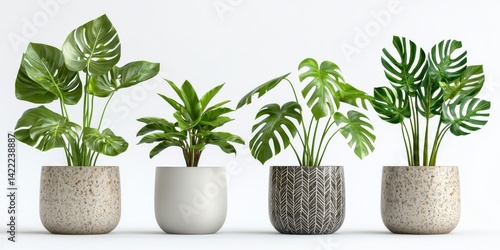Four stylish potted plants in decorative pots, showcasing lush green foliage, perfect for indoor decor and enhancing natural aesthetics.