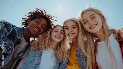 Four teenagers smile broadly at the camera while standing under a clear blue sky, showcasing their friendship, happiness, and teenage camaraderie, against a sunny backdrop.