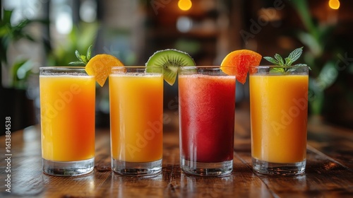 Four vibrant fruit smoothies in tall glasses, orange, kiwi, peach, and red