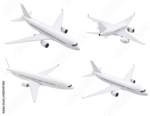 Four white jet airliners, various angles, isolated, used for transportation & travel visuals