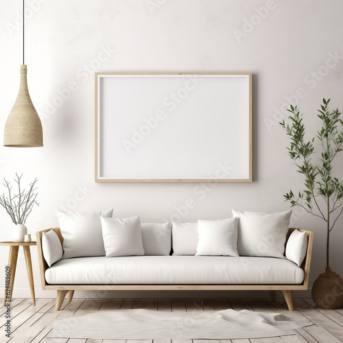 Frame mockup in minimalist decorated interior background, 3d render, white couch created using generative ai
