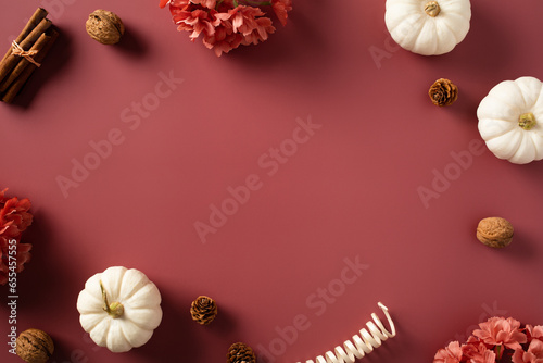 Frame of white decorative pumpkins, cinnamon sticks, flowers, fall decor, walnuts on dark red background. Flat lay, top view.