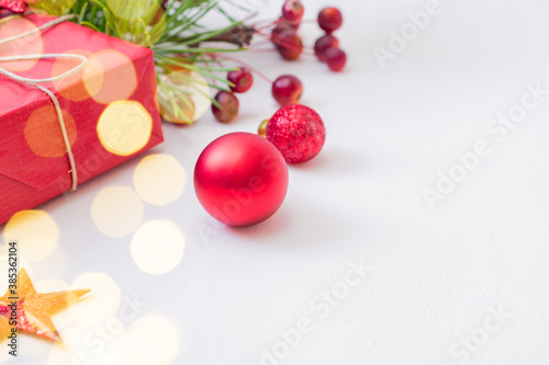 Frame with red christmas decoration, pine branches and gift box on a white background