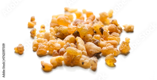 Frankincense olibanum resin, Boswellia sacra Isolated on white background. Frankincense or olibanum aromatic resin used in incense and perfumes, border design, macro shot.