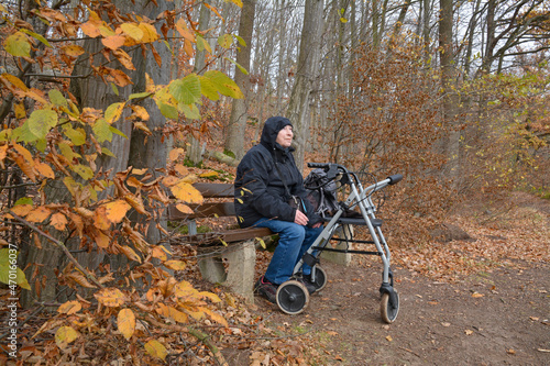 woman, walker, handicap, handicapped, old, walk, underway, way, walk, move, walker, outside, sitting, break, countryside, nature, autumn, forest