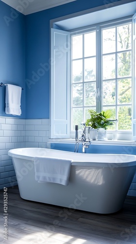 bathtub, bathroom, blue, white, sunlit, freestanding, tub, modern, luxury, interior, design, home, decor, spa, relaxation, serene, tranquil, window, shutter, tile, wood, floor, clean, bright, elegant, stylish, room, house, apartment, renovation, remodel, vintage, classic, country, contemporary, minimalism, aesthetic, comfort, wellness, water, sanctuary, peaceful, restful, escape, sophisticated