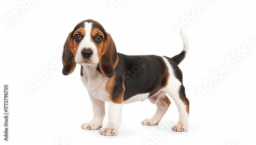 French Basset Artisien Normand Puppy Upright and Facing Forward on a White Background, Focus on Playfulness