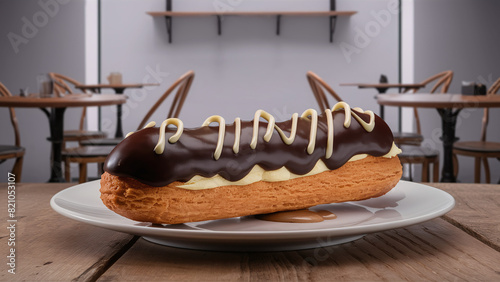 french Éclair dessert on surface, blurred bakery shop in the background, professional commercial product photography