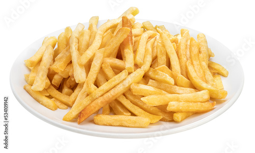 French fries in white plate isolated on white background, French fries on white plate PNG file.