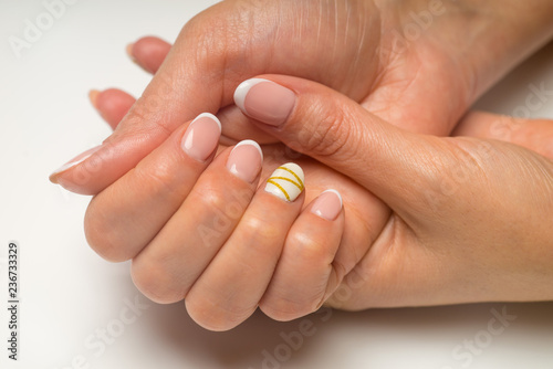 French manicure and nail gel Polish. Young, perfect, groomed woman's hands with pink and white nail varnish bottles.