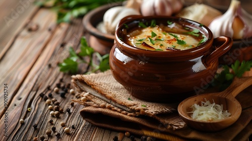 French onion soup in a brown ceramic bowl on a rustic wooden table with ingredients : Generative AI