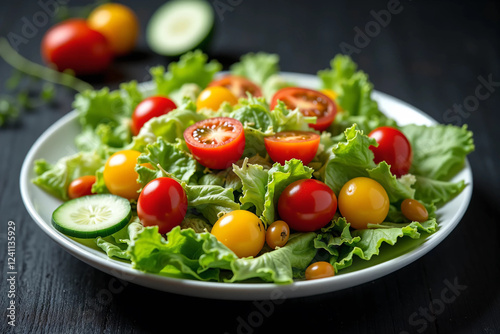 Fresh and Colorful Salad with Crisp Lettuce, Cherry Tomatoes, and Cucumber Slices on a Ceramic Plate Healthy Vegan Meal with Natural Lighting, Perfect for a Nutritious Diet and Food Photography Inspir