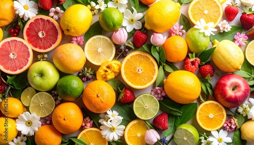 Fresh and juicy mix of sliced citrus, whole apples, and ripe strawberries arranged with blossoms for a vibrant, healthy food background