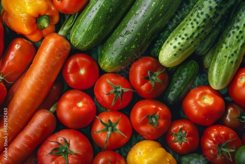 Fresh and vibrant assortment of vegetables, featuring carrots, tomatoes, and cucumbers, captured in a detailed and colorful composition.