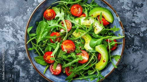 Fresh and Vibrant Salad with Cherry Tomatoes Arugula and Avocado Slices in a Ceramic Bowl