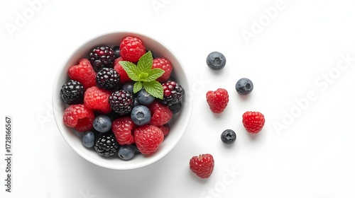Fresh assorted berries including raspberries, blueberries, and blackberries in a white bowl with mint leaves on clean white background, symbolizing healthy eating and summer freshness