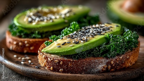 Fresh avocado toast with kale and sesame seeds on wooden plate is a healthy and delicious breakfast snack.