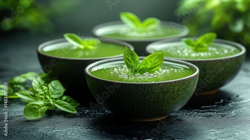 Fresh Basil Soup in Dark Bowls