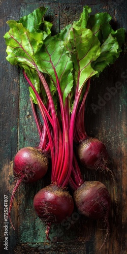 Fresh Beets with Vibrant Greens on Dark Rustic Wood - Organic & Healthy Vegetable Composition