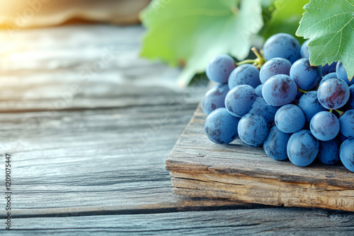Fresh Blue Grapes on Wooden Surface with Green Leaves and Natural Lighting Effects