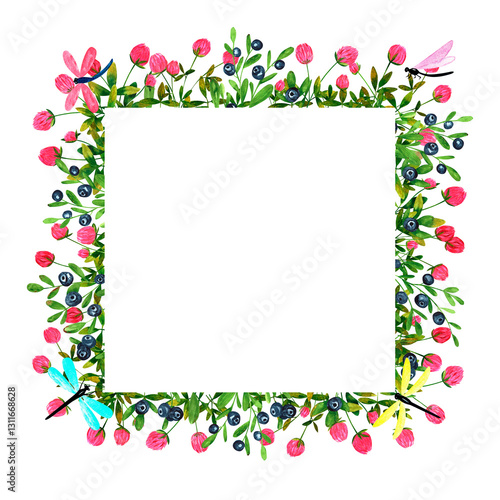 Fresh blueberries and clover flowers background. Set of frames of watercolor berries and clovers, dragonflies, butterflies, bumblebees and bees. Clip art, design element.