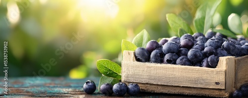 Fresh blueberries overflowing from a rustic wooden crate with green leaves, set on a weathered blue surface in natural sunlight.