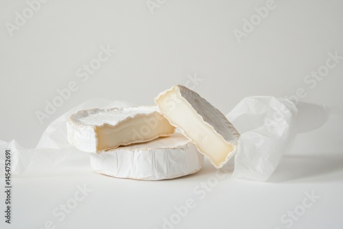 Fresh camembert cheese with sliced camembert isolated. Top view of camembert cheese piece on white background. Brie cheeses. Dairy products. Set of big round french cheeses with white mold.