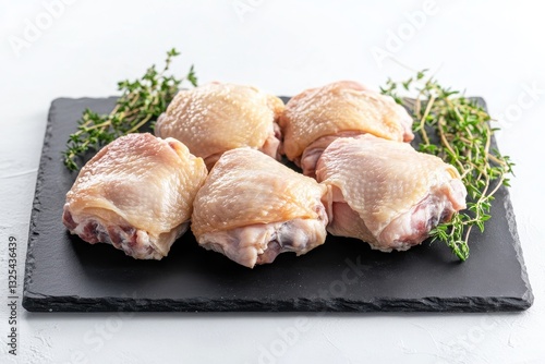 chicken, thigh, raw, meat, food, herb, thyme, fresh, ingredient, preparation, cooking, kitchen, protein, culinary, dish, healthy, organic, epicure, meal, receipe, snack, nourishment, favor, texture, tabletop, professional, dinner, lunch, grill, roast, bake, presentation, black, slate, closeup, arrangement, style, natural, rustic, simple, clean, bright, white, casual attire