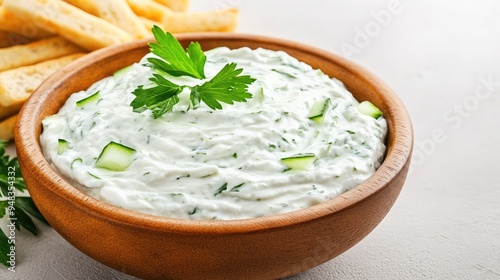 Fresh cucumber slices are paired with a smooth cream cheese spread in a wooden bowl, complemented by crunchy grissini on a lovely beige kitchen table