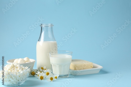 Fresh dairy products and chamomile flowers on light blue background. Space for text