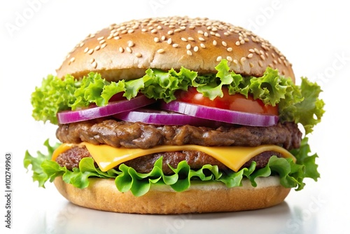 fresh delicious hamburger with beef meat onion lettuce cucumbers cheese white background