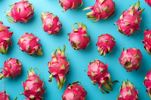 Fresh dragon fruit slices on blue background, top view flat lay of vibrant tropical fruit, healthy organic food concept
