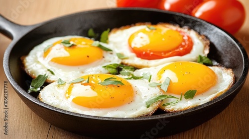 Fresh Eggs in Cast Iron Skillet with Herbs and Tomatoes