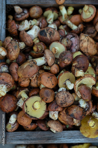 mushroom, wild, raw, yellow, food, forest, vegetable, ingredient, edible, background, mushroom, fresh, nature, organic, rustic, closeup, healthy, natural, space, season, orange, autumn, fungal, group, crate, box, wooden, boletus