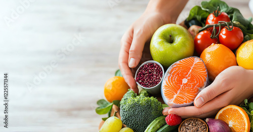 Fresh fruits and vegetables arranged beautifully, featuring salmon, berries, and greens. A vibrant display promoting healthy eating habits and the abundance of nature's produce.