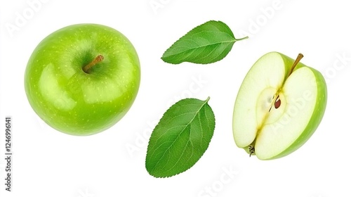 Fresh Green Apple with Cut Pieces and Leaves on White Background