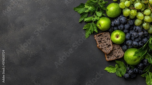 Fresh Green Apples, Blueberries, Grapes and Herb Leaves Arrange on a Dark Stone Surface for Healthy Eating and Gourmet Culinary Presentation