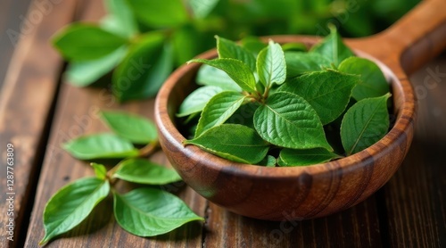 Fresh Green Leaves in Wooden Bowl on Rustic Surface A Vibrant Image of Nature's Bounty