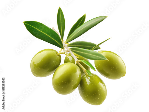 Fresh green olives on a branch with leaves isolated against a dark transparent background