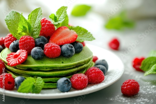 Fresh Green Pancakes with Berries and Mint Garnish
