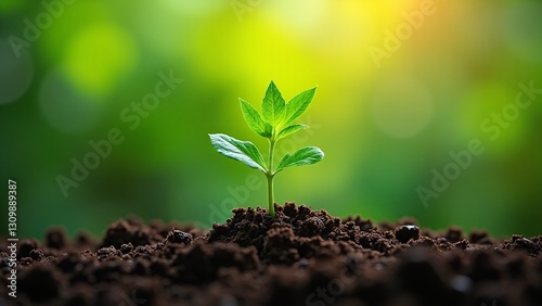 Fresh Green Seedling Growing in Dark Soil Against a Bright Background