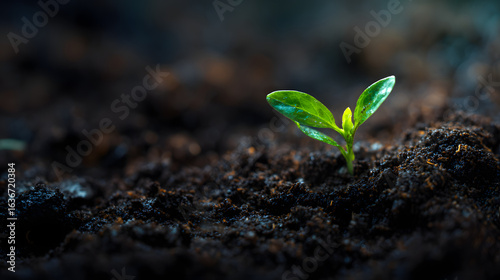 Fresh Green Seedling Sprouting from Rich Dark Soil in Nature