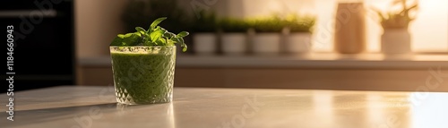 Fresh green smoothie in a glass on a kitchen countertop with natural light illuminating the scene.