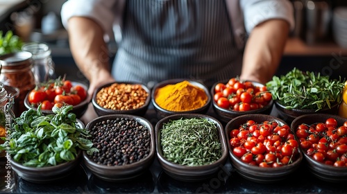 Fresh herbs and spices are carefully arranged by a chef on a kitchen counter.
