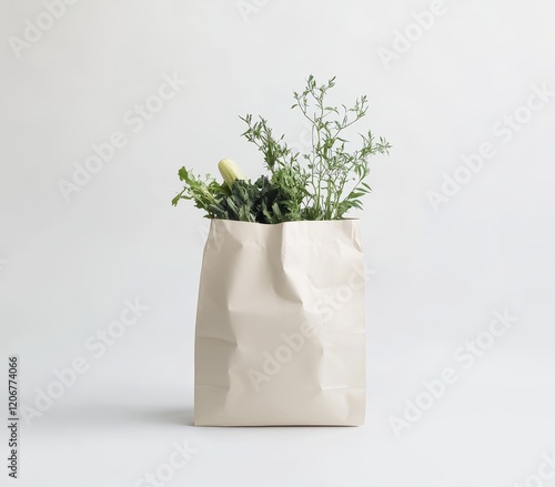 herb, vegetable, greener, food, grocery, bag, paper, organic, healthy, fresh, produce, market, shopping, eco, sustainable, natural, plant, leaf, green, white, background, studio, simple, minimal, clean, diet, nourishment, cooking, ingredient, farm, harvest, rustic, texture, isolated, design, element, cardboard box, environmentally friendly, environment, nature, growth, germinating, stem
