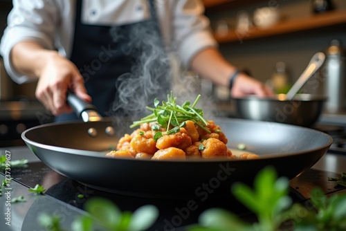 Fresh herbs scattered near chef as they prepare gourmet dish in modern kitchen with close-up macro view and steam from sizzling pan