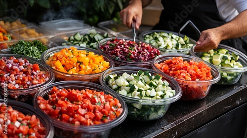 Fresh Ingredients Are Prepared at a Bustling Outdoor Market Stall as a Vendor Arranges Colorful Bowls of Chopped Vegetables