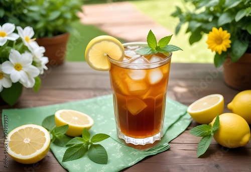 Fresh juice with lemon slices and mint served on a wooden table against a backdrop of green trees and leaves.