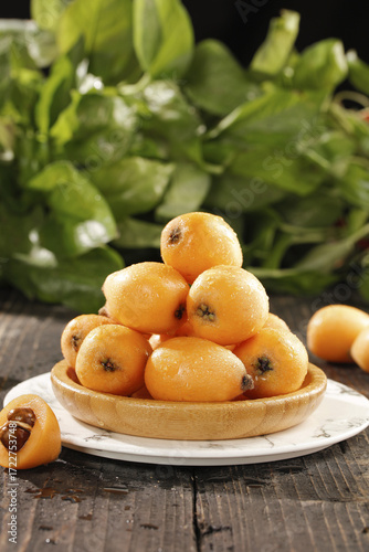 Fresh Loquat Fruits from Panzhihua Alpine Region - Organic Tropical Produce on Rustic Wooden Table