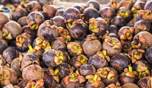 Fresh mangosteen for sale at an outdoor market.